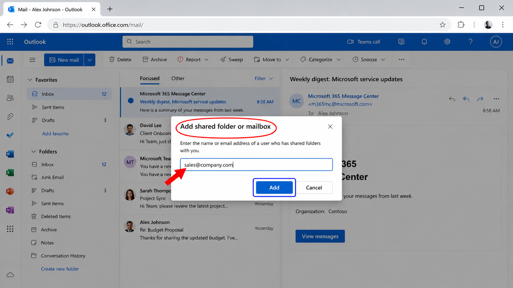 Select Add shared folder or mailbox.