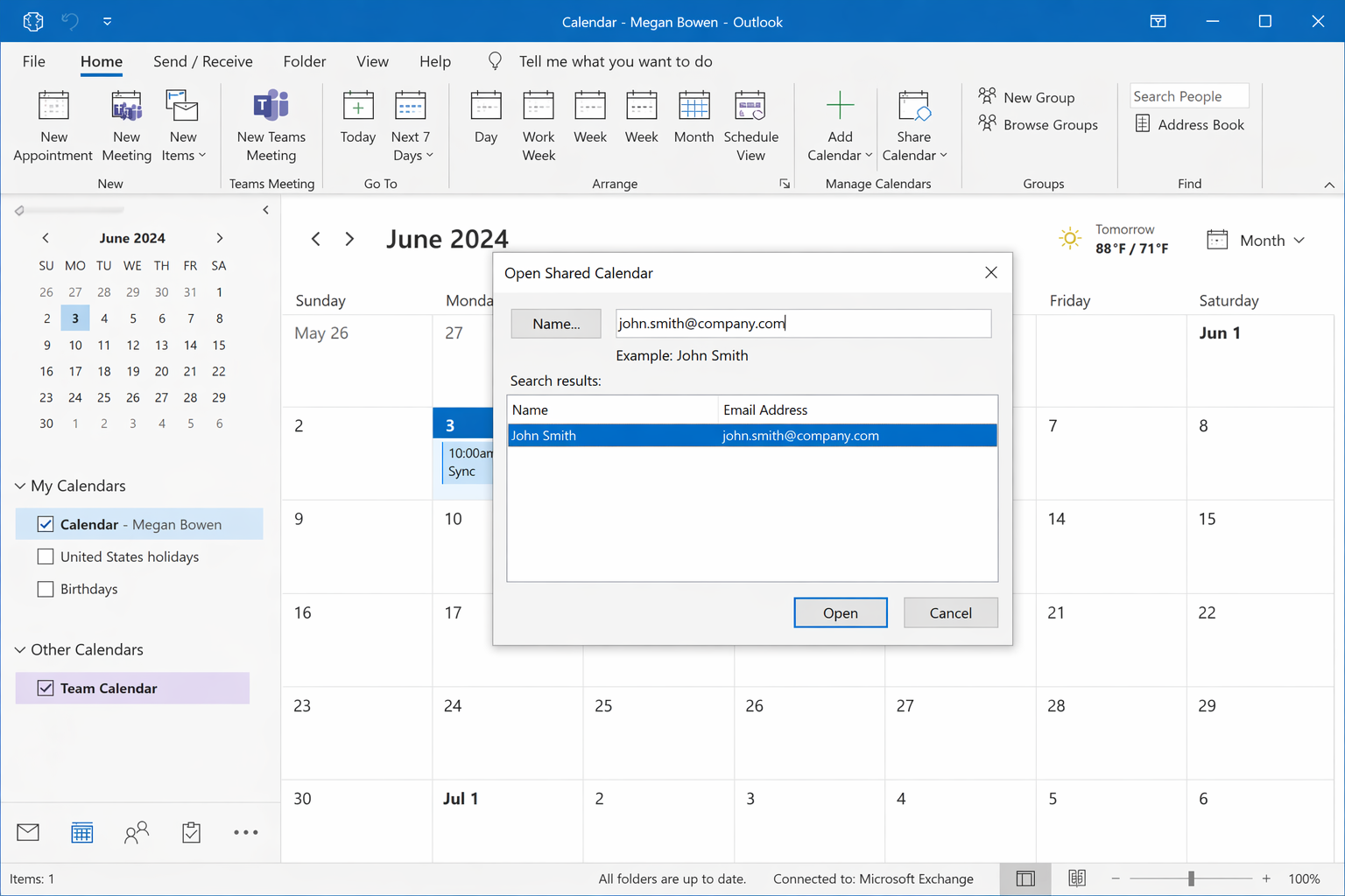 Select the calendar, then click Open. The shared calendar will appear in your calendar list.