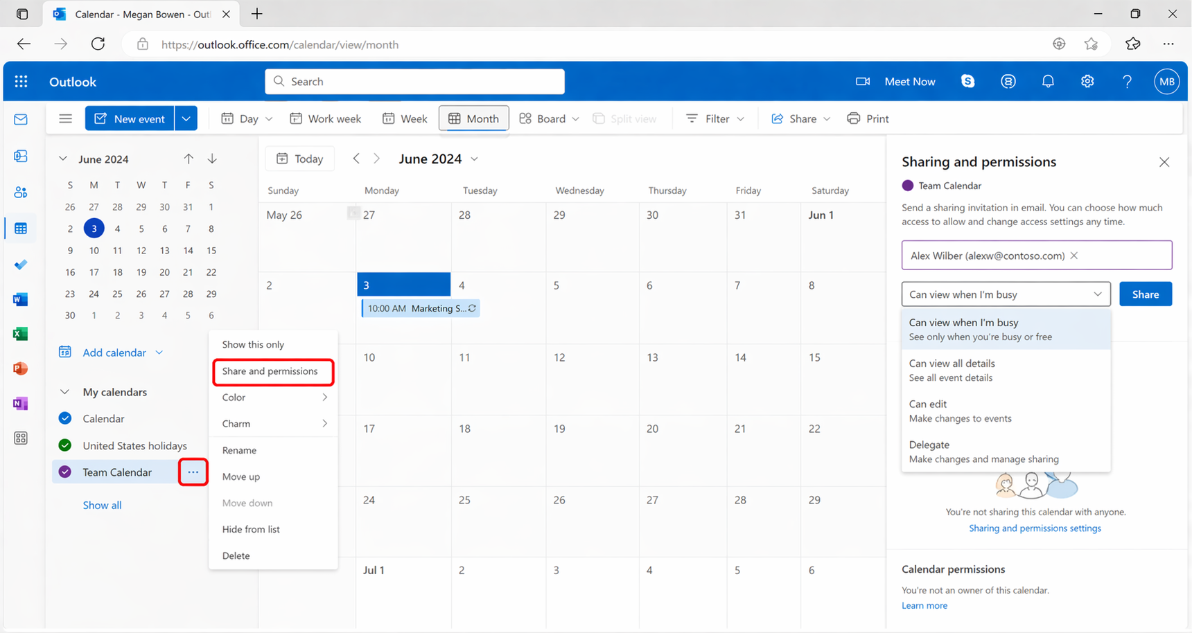 Hover over the calendar name, click the three dots menu, then select Sharing and permissions.