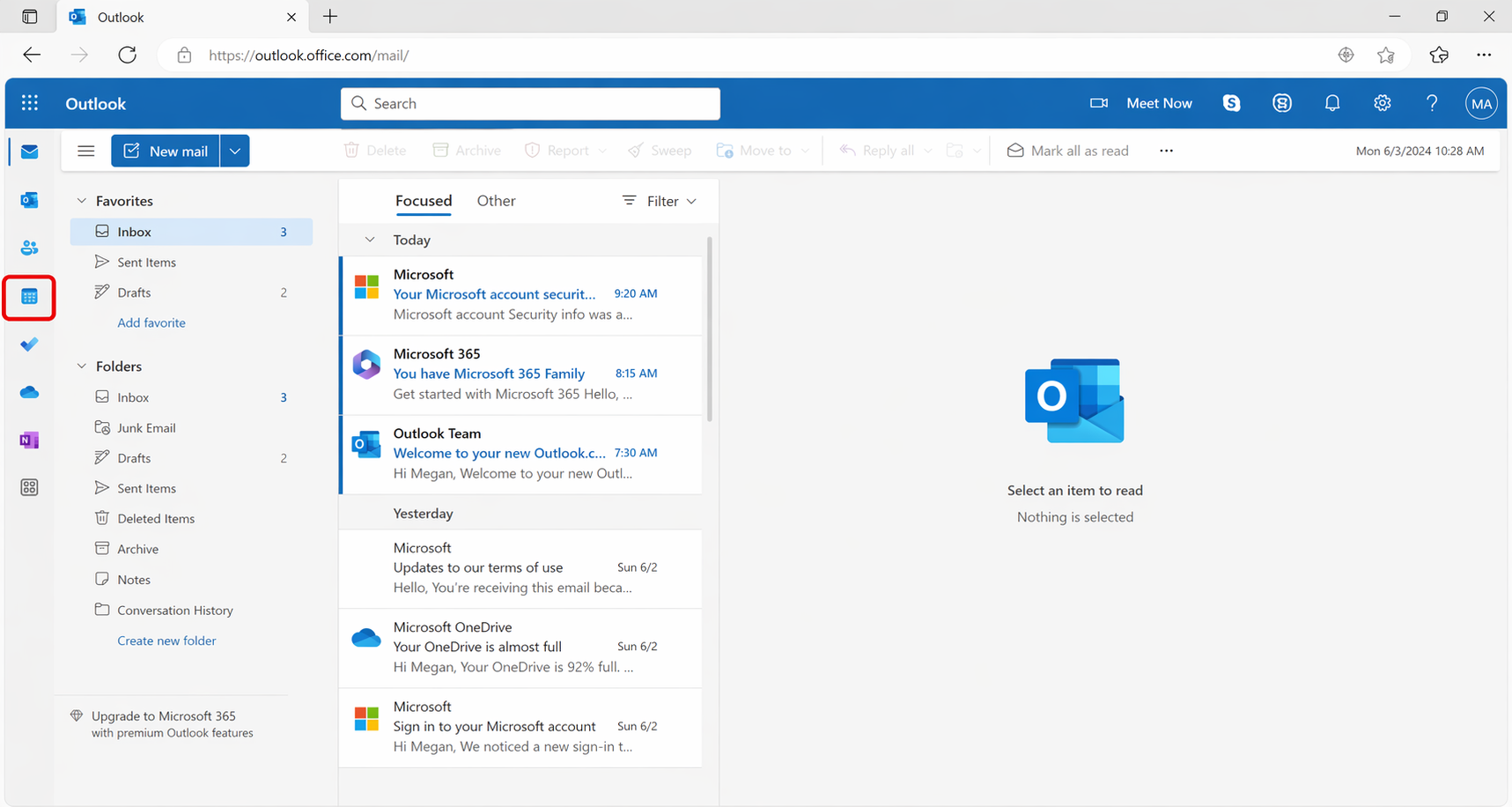 In Outlook on the web, select the Calendar icon from the left-hand menu.