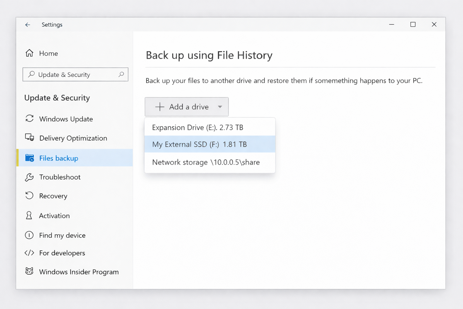 - Use an external or network drive: Do not store backups on the same drive as your main files.