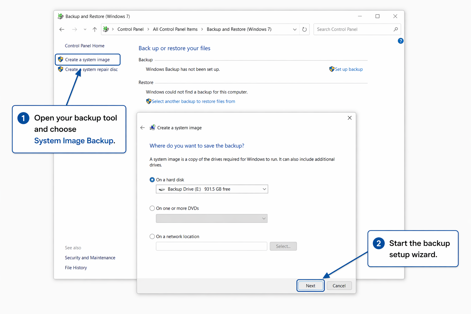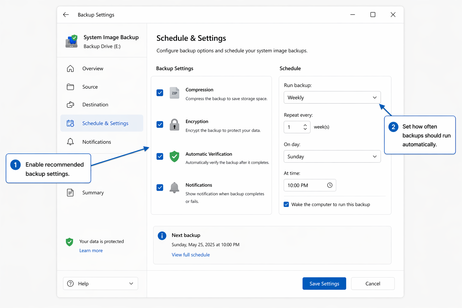 A system image backup creates a complete copy of your operating system, installed programs, settings, and files. It allows you to fully restore your computer after a crash, malware infection, hardware failure, or severe system corruption.